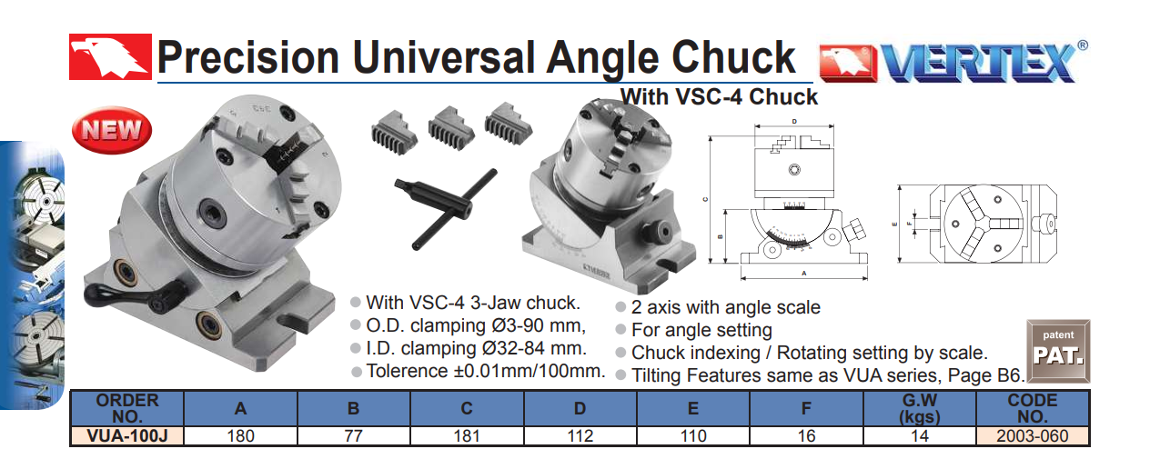 Mâm cặp chia độ nghiêng VUA-100J của VERTEX có chất lượng cao, kẹp nhanh bằng mâm cặp 3 chấu, chia độ nhanh chính xác bằng bàn chia và điều chỉnh góc nghiêng trên đế bán cầu trượt trên rãnh mang cá.
