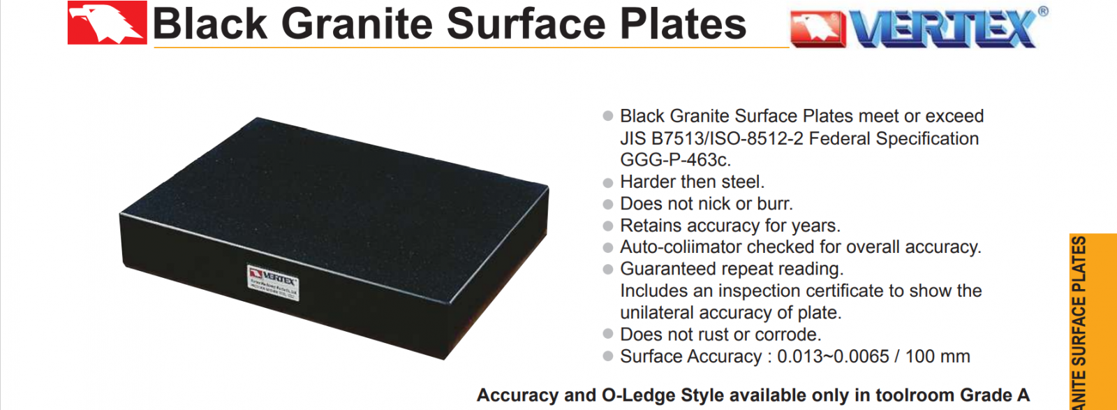 – Bàn Máp dùng làm mặt chuẩn, đo so sánh với căn mẫu chuẩn các chi tiết cơ khí chính xác, nên các bàn Máp bằng đá Granite Vertex có độ chính xác rất cao: độ phẳng đạt từ 0.013~0.0065/100mm.