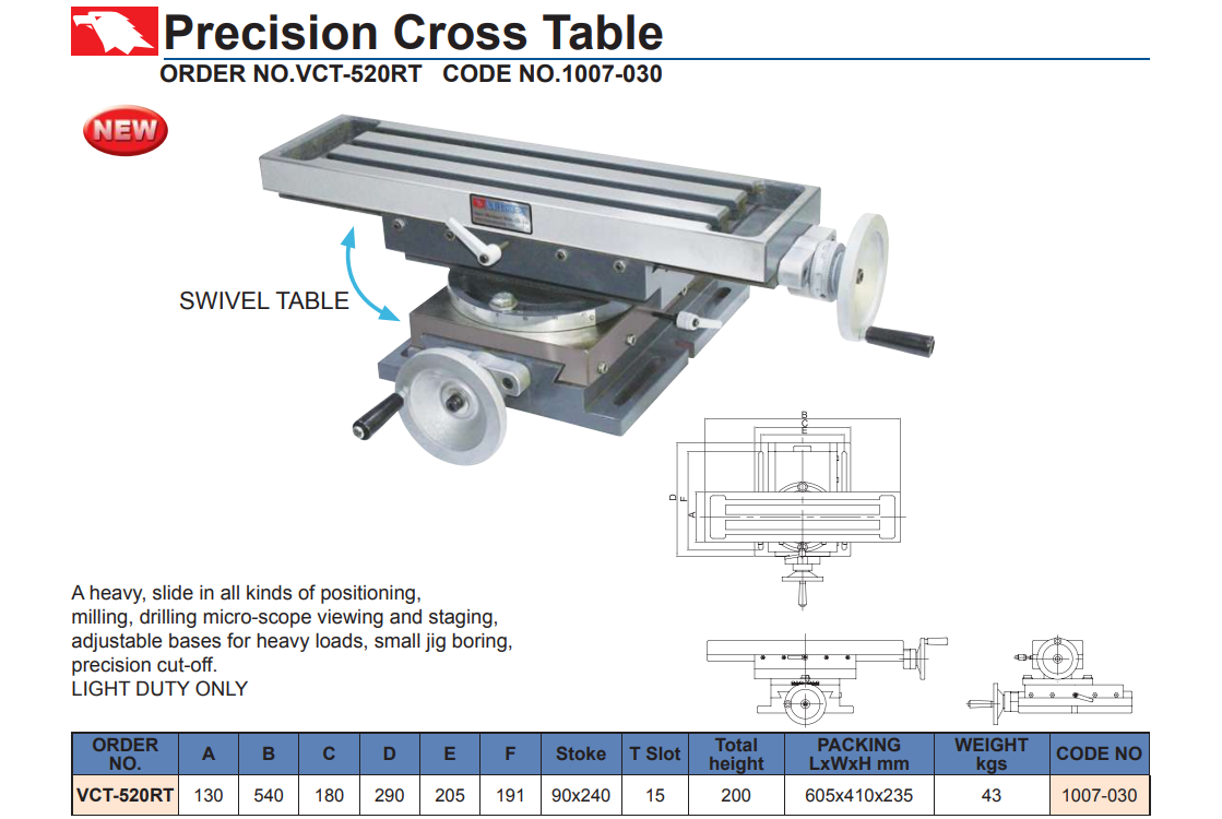 + Bàn máy phay chữ thập VCT-520RT được sử dụng rộng rãi trên máy phay , máy mài , máy khoan , máy gia công trung tâm điều khiển chạy theo 2 chiều X, Y và có đế xoay tròn. Có thể thay thế bàn máy hoặc lắp lên các máy loại nhỏ để gia công.