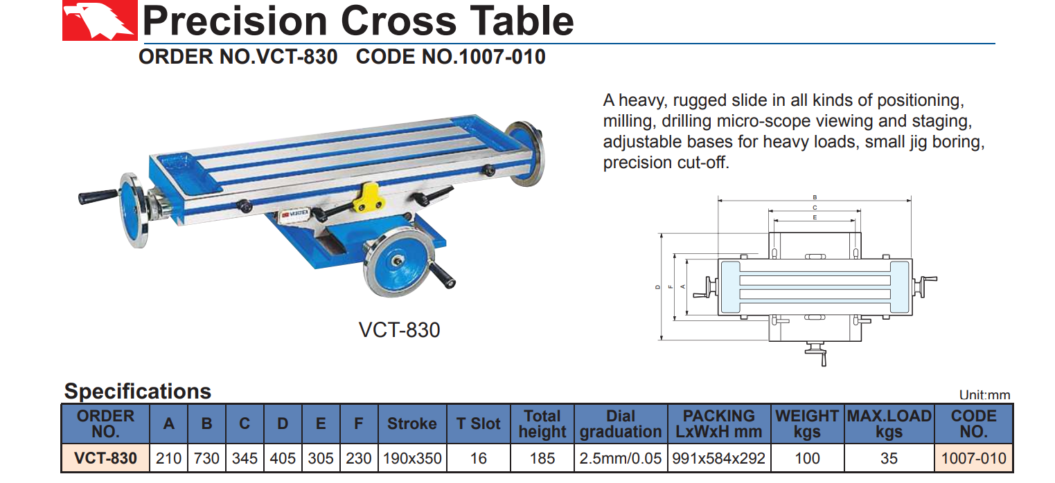 BÀN MÁY PHAY CHỮ THẬP VCT của VERTEX được gắn lên các máy gia công cỡ nhỏ để gia công các chi tiết tương tự như một máy phay bình thường . Bàn máy có thể di chuyển theo 2 chiều X Y bằng các tay quay có vạch chia . Độ chính xác 0.02/100 mm . Vật liệu chế tạo FC-30
