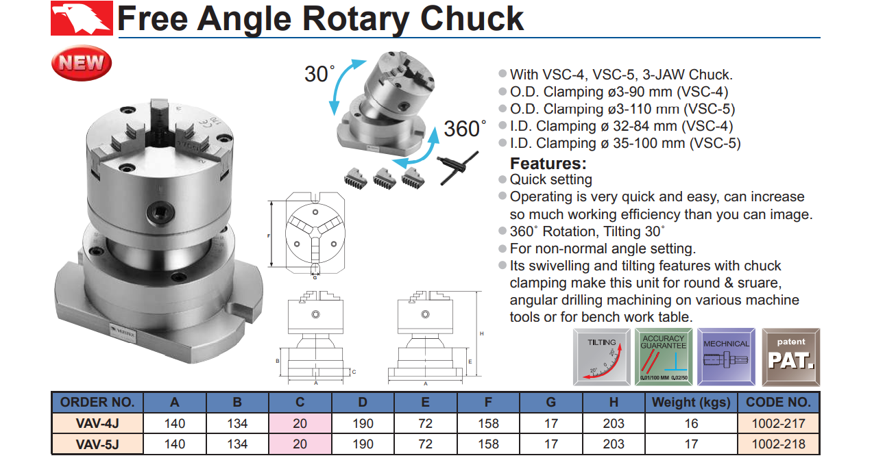Bàn xoay mâm cặp góc nghiêng tự do VAV Vertex thích hợp cho bề mặt phẳng hoặc nghiêng, gia công khoan góc trên các loại máy công cụ khác nhau như: máy mài, máy khoan, máy phay....