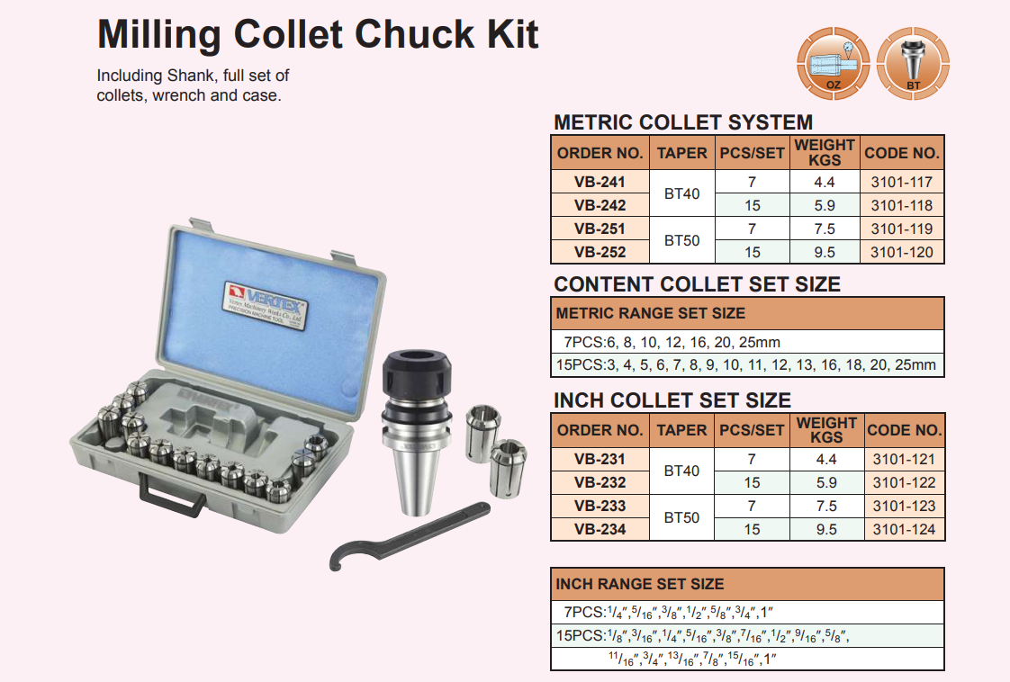 – 1 bộ bầu kẹp collet OZ25 bao gồm: 1 bầu kẹp, 1 chìa vặn, 1 hộp đựng và 7 hoặc 15 collet.