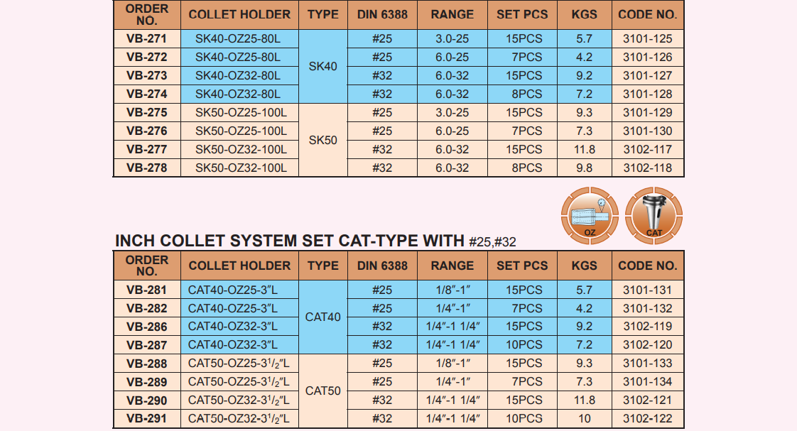– Collet OZ-25, OZ-32 theo tiêu chuẩn MAS (xem sản phẩm Collet OZ).