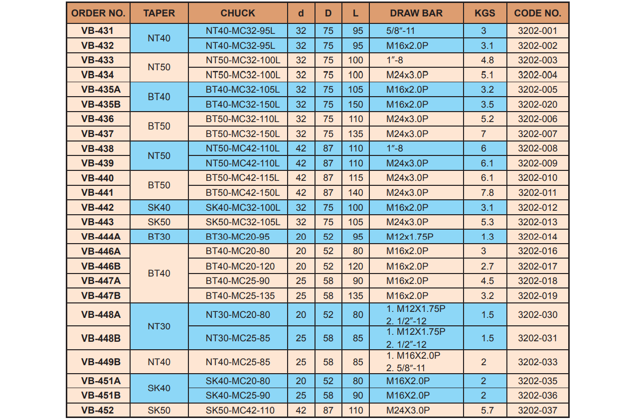 – Bảng bầu kẹp collet trụ C-32, C-42, C-20, C-25: VB-431, VB-432, VB-433, VB-434, VB-435A , VB-435B, VB-436, VB-437, VB-438, VB-439, VB-440, VB-441, VB-442, VB-443, VB-444A, VB-446A, VB-446B, VB-447A, VB-447B, VB-448A, VB-448B, VB-449B, VB-451A, VB-451B, VB-452