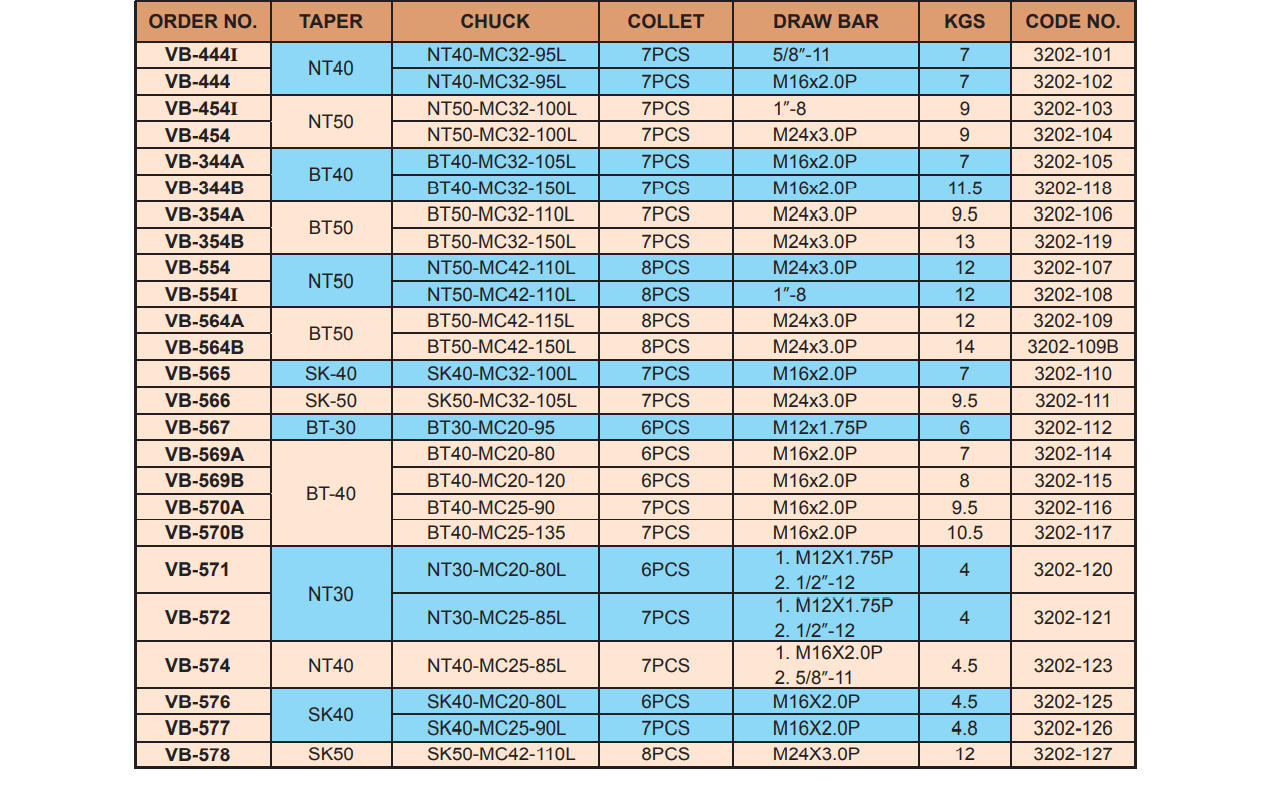 Bảng bộ bầu kẹp collet trụ C-32, C-42, C-20, C-25 đầy đủ: VB-444I, VB-444, VB-454I, VB-454, VB-344A, VB-344B, VB-354A, VB-354B, VB-554, VB-554I, VB-564A, VB-564B, VB-565, VB-566, VB-567, VB-569A, VB-569B, VB-570A, VB-570B, VB-571, VB-572, VB-574, VB-576, VB-577, VB-578