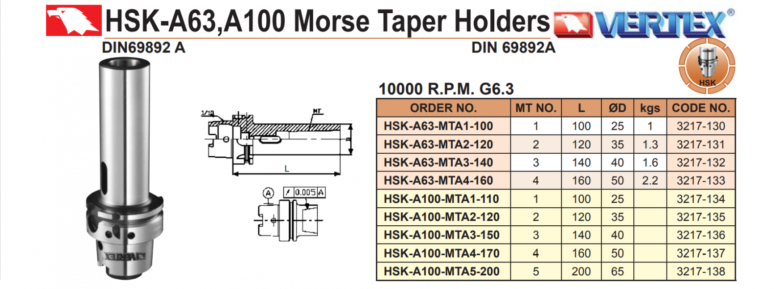 – Bầu kẹp dao chuôi HSK-A63, HSK-A100 của VERTEX dùng gá kẹp dao phay, mũi khoan, mũi doa, ta rô khi gia công, với tốc độ cao, trên máy phay NC kiểu côn HSK-A63, HSK-A100.