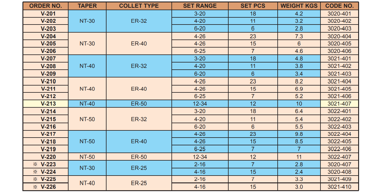 Bảng bộ bầu kẹp dao phay NT-ER đầy đủ: V-201, V-202, V-203, V-204, V-205, V-206, V-207, V-208, V-209, V-210, V-211, V-212, V-213, V-214, V-21, V-216, V-217, V-218, V-219, V-220, V-223, V-224, V-225, V-226