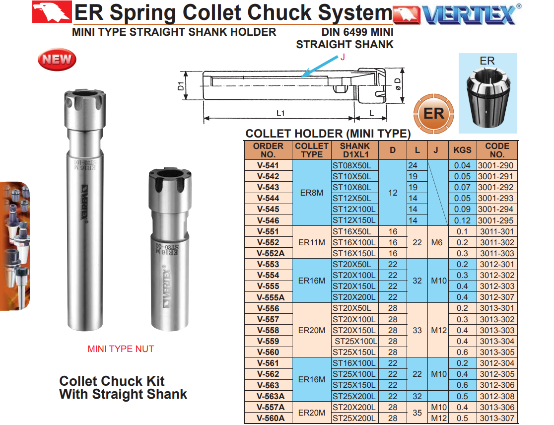– Collet ER08, ER11, ER16, ER20 theo tiêu chuẩn DIN 6499 (xem sản phẩm Collet ER).