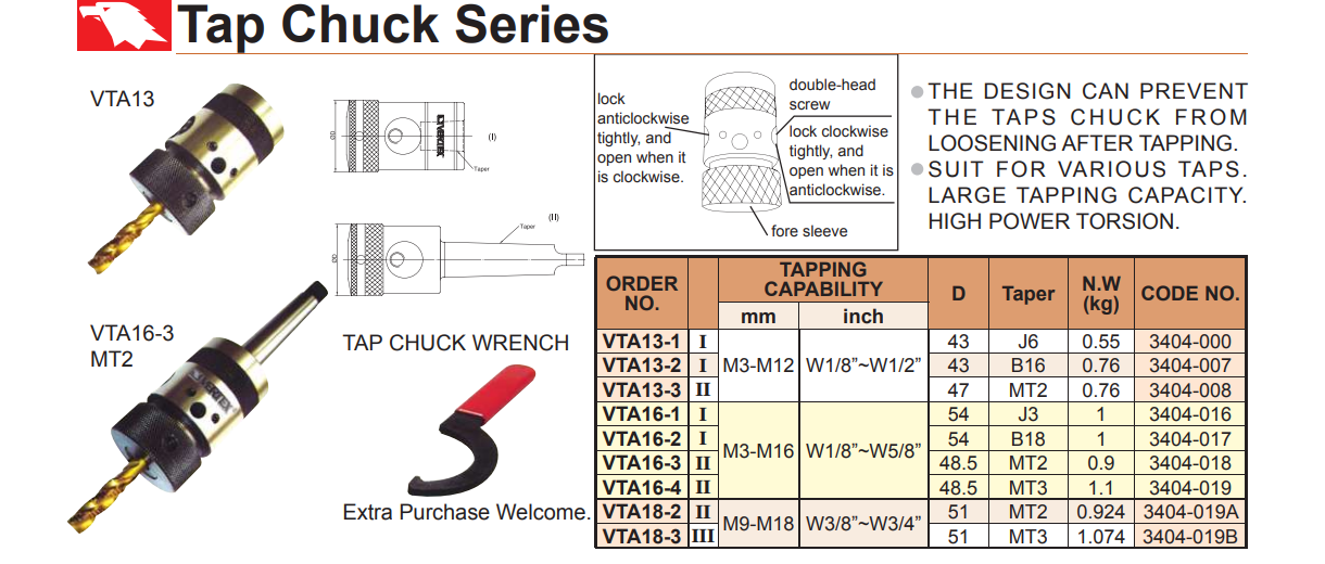 – Bầu kẹp ta rô kiểu vô cấp VERTEX: VTA13-1, VTA13-2, VTA13-3, VTA16-1, VTA16-2, VTA16-3, VTA16-4, VTA18-2, VTA18-3, VTA-13-11, VTA-13-12
