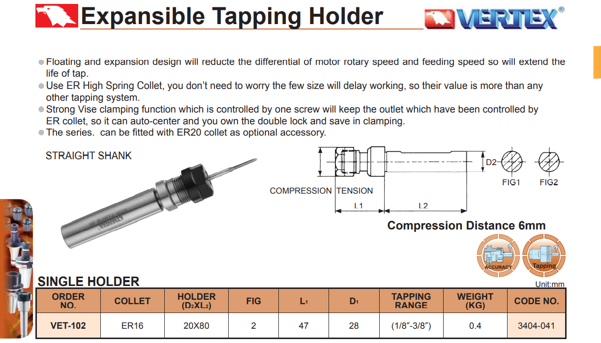 – Bầu kẹp ta rô VET của VERTEX kẹp ta rô bằng các collet ER20 và ER32.