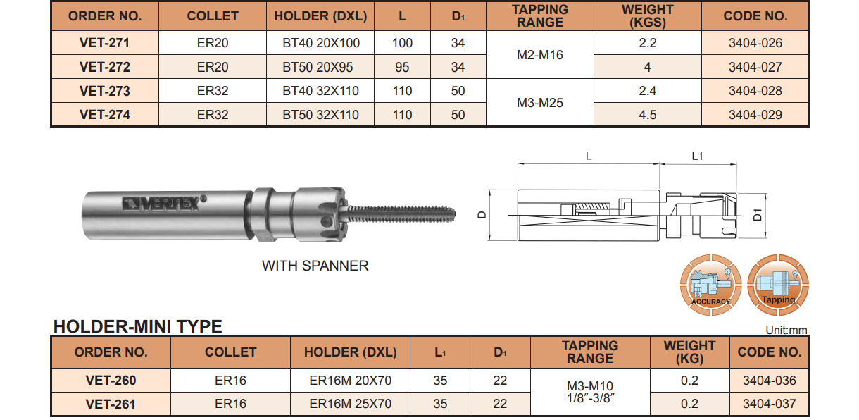 – Bầu kẹp ta rô kiểu collet ER VET-271, VET-272, VET-273, VET-274, VET-260, VET-261, VET-102, VET-202, VET-252, VET-303, VET-105, VET-106, VET-253, VET-254