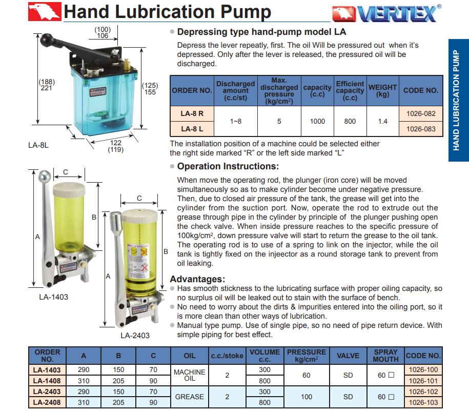Bộ bơm dầu bằng tay Vertex LA-8R dùng để bơm dầu bôi trơn cho băng máy và các cơ cấu truyền động bằng tay khi hoạt động.