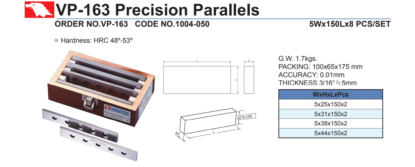 – Khối lượng toàn bộ căn đệm chính xác VP-163 là 1.7 Kg. Kích thước đóng gói: 175*85*55mm.