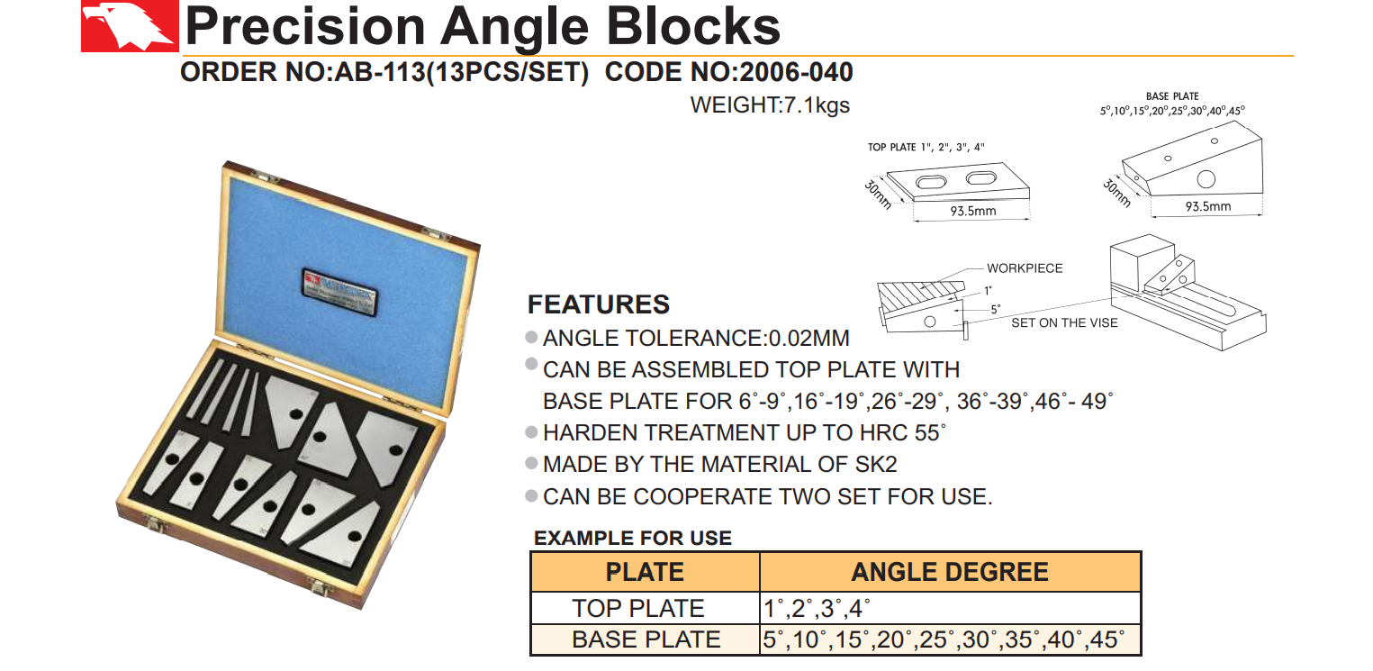 – Bộ căn góc chính xác AB-130, AB-163, AB-164, AB-166, AB-167, AB-113 của VERTEX được sử dụng để kê định vị tạo góc nghiêng cho chi tiết khi phay, khoan, mài,…