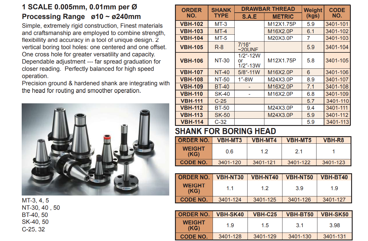 – Bộ dao doa lỗ VBH của VERTEX: VBH-102, VBH-103, VBH-104, VBH-105, VBH-106, VBH-107, VBH-108, VBH-109, VBH-110, VBH-111, VBH-112, VBH-113, VBH-114 sử dụng thích hợp doa lỗ có đường kính từ 10 – 240mm.