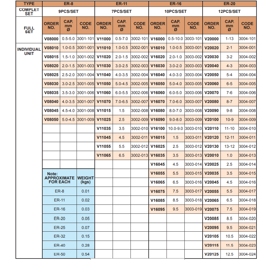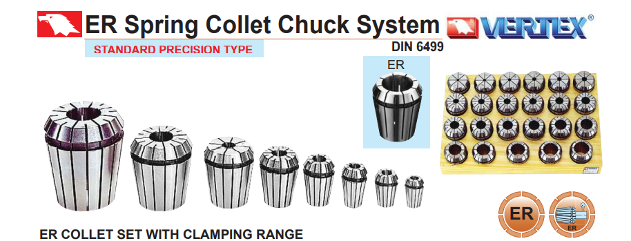 COLLET ER tiêu chuẩn hãng Vertex sản xuất với chất lượng cao, có đầy đủ các kiểu size cho bạn lựa chọn, từ loại ER-8 đến ER-50 phù hợp các loại bầu kẹp . Sản phẩm được phân phối trên toàn quốc.