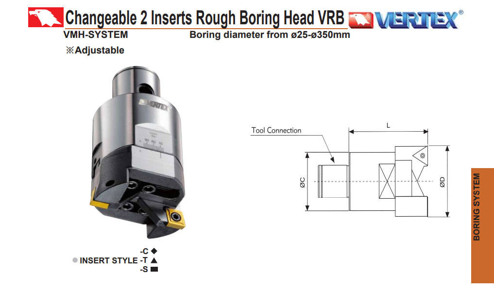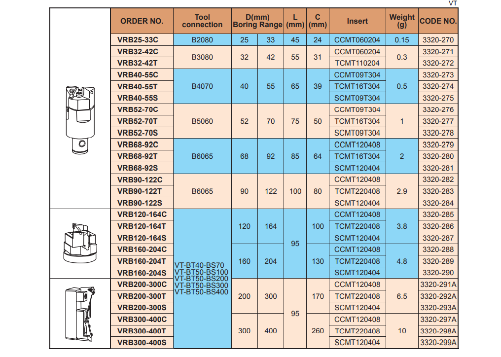 – Đầu dao doa thô ghép mảnh từ f25 ~ f350: VRB25-33C, VRB32-42C, VRB32-42T, VRB40-55C, VRB40-55T, VRB40-55S, VRB52-70C, VRB52-70T, VRB52-70S, VRB68-92C, VRB68-92T, VRB68-92S, VRB90-122C, VRB90-122T, VRB90-122S, VRB120-164C, VRB120-164T, VRB120-164S, VRB160-204C, VRB160-204T, VRB160-204S, VRB200-300C, VRB200-300T, VRB200-300S, VRB300-400C, VRB300-400T, VRB300-400S của VERTEX sử dụng doa thô đường kính lỗ từ D25 ~ D350mm, trên máy phay CNC BT30, BT40, BT50.