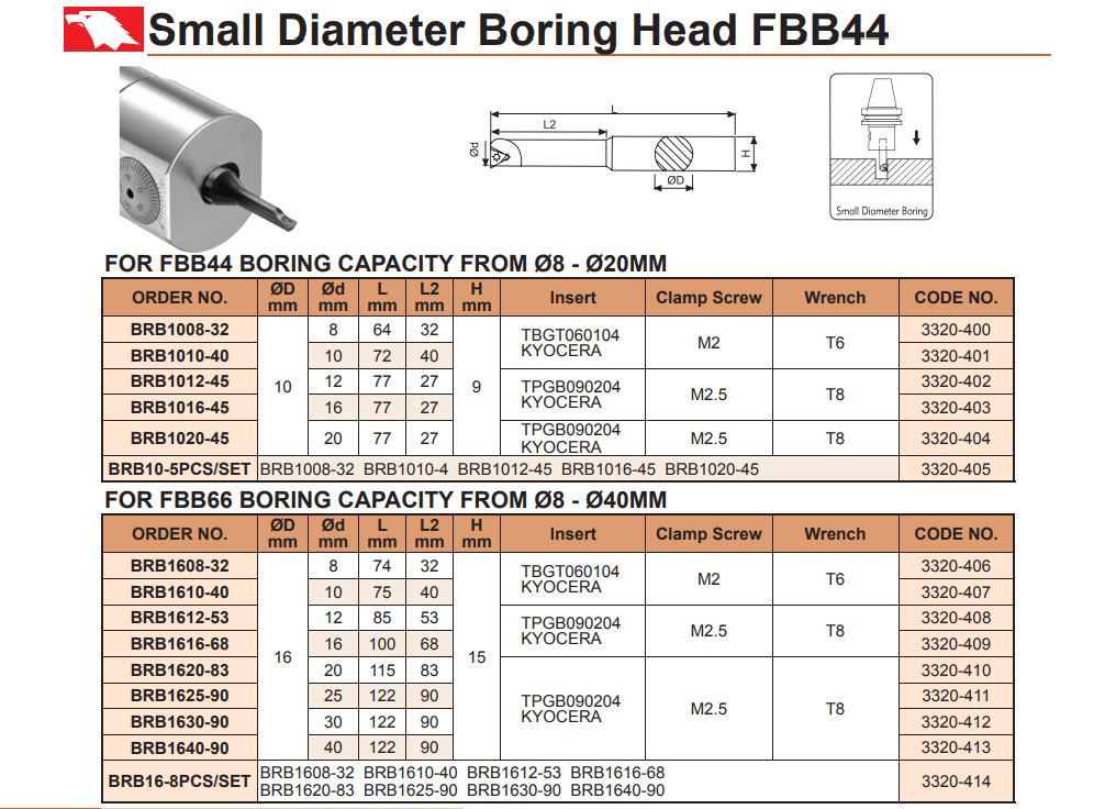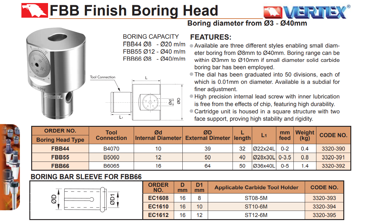 – Đầu doa tinh nhỏ: BRB1008-32, BRB1010-40, BRB1012-45, BRB1016-45, BRB-1020-45, BRB10-5PCS/SET, BRB1608-32, BRB1610-40, BRB1612-53, BRB1616-68, BRB1620-83, BRB1625-90, BRB1630-90, BRB1640-90, BRB16-8PCS/SET của VERTEX sử dụng doa tinh đường kính lỗ từ D8 ~ D40mm, trên máy phay CNC BT30, BT40, BT50.