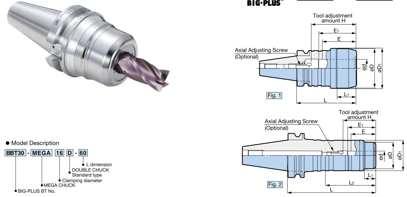 | BBT SHANK Model | Fig. | Clamping diamater φd | φD | ΦD1 | L | L1 | L2 | H | Min.clamping length | Mega Wrench |