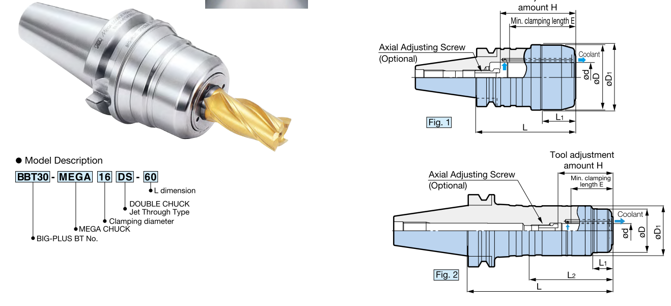 | BBT SHANK Model | Fig. | Clamping diamater φd | φD | ΦD1 | L | L1 | L2 | H | E | Mega Wrench |