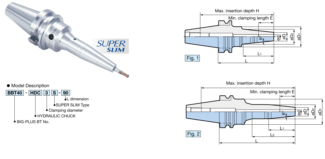 | BBT SHANK Model | Fig. | Clamping diamater φd | φD | ΦD1 | ΦD2 | L | L1 | L2 | H | E |