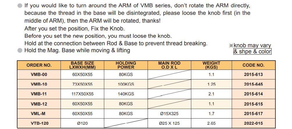 – Đế từ nam châm VMB-00, VMB-09, VMB-10, VMB-11, VMB-12, VML-M, VTB-120 của VERTEX sử dụng để kẹp chặt thiết bị lắp trên nó với mặt bàn gá bằng lực hút từ.