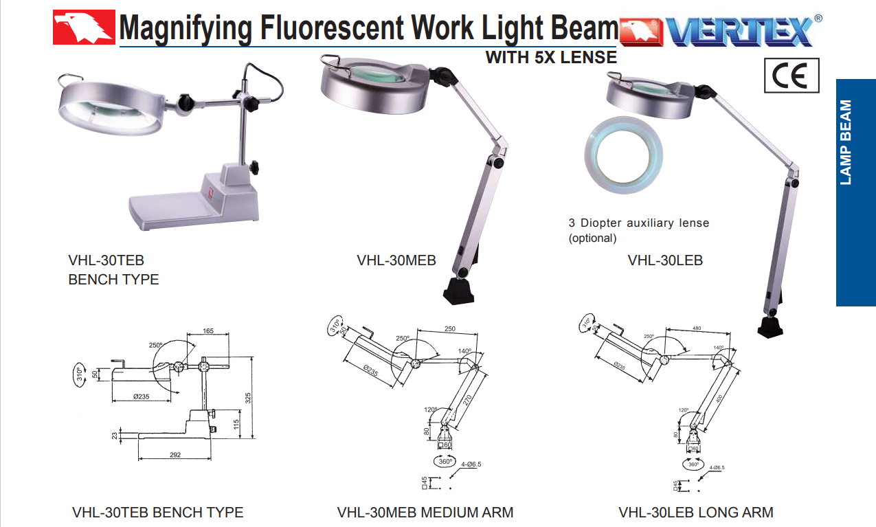 – Đèn kính lúp huỳnh quang lắp kính lúp 5 đi-ốp được sử dụng phóng đại vật lên 2.25 lần và chiếu ánh sáng huỳnh quanh để kiểm tra sản phẩm. Có thể lắp kính lúp 3 đi-ốp (VHL-3X) để phóng đại 1.75 lần sản phẩm.