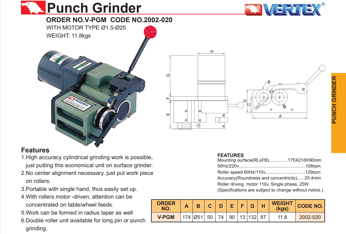 Đồ gá mài chốt dùng mô tơ điện mã V-PGM được sản xuất bởi hãng Vertex nổi tiếng thương hiệu về sản xuất, phụ kiện máy gia công cơ khí. Sản phẩm được nhập khẩu từ Vertex, CO, CQ được cấp bởi phòng thương mại Đài Loan. Hỗ trợ đắc lực trong công việc gia công của bạn.