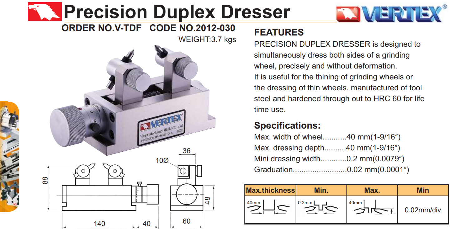 – Đồ gá sửa đá mài kép V-TDF của VERTEX được sử dụng để sửa đồng thời 2 mặt bên của đá mài.