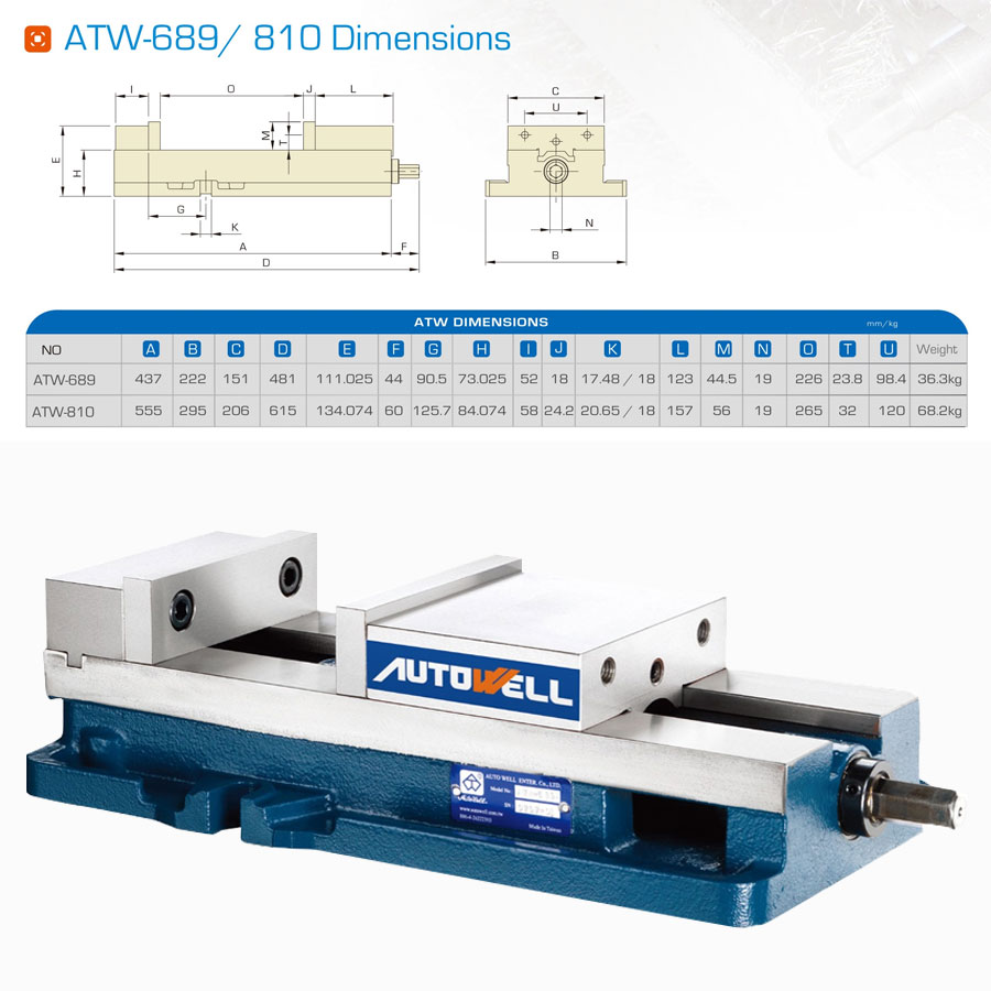 Ê tô cơ ATW-689A (hay còn gọi là Eto ATW-689A, E TO ATW-689A, ETO AUTO WELL ATW-689A, Ê Tô Auto well ATW-689A) là một loại ê tô cơ khí chất lượng cao, được sử dụng phổ biến trong các công việc gia công, sửa chữa, và lắp ráp trong ngành cơ khí. Sản phẩm này thường được biết đến với độ bền, khả năng giữ chặt phôi tốt, và thiết kế chắc chắn, phù hợp cho các xưởng cơ khí hoặc công việc đòi hỏi độ chính xác cao. Thương hiệu Auto Well là một trong những nhà sản xuất dụng cụ cơ khí uy tín, đảm bảo chất lượng và hiệu suất của sản phẩm.