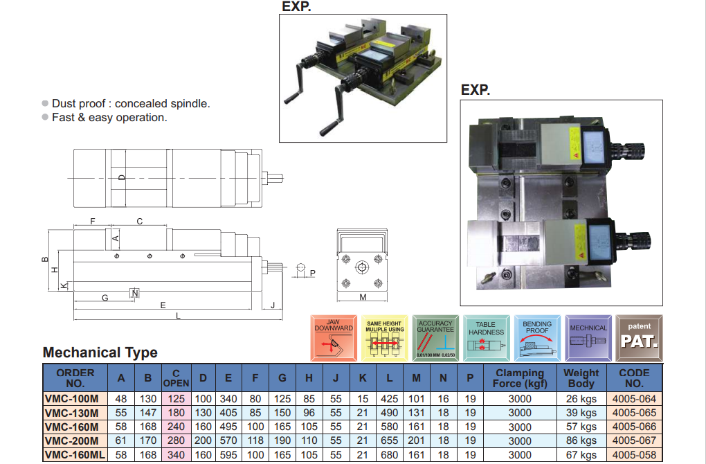 • Ê TÔ CƯỜNG LỰC CHÍNH XÁC mã VMC-100M, VMC-130M, VMC-160M, VMC-200M được hãng Vertex sản xuất với chất lượng cao, ê tô này được dùng nhiều trên các loại máy phay CNC, NC và một số loại máy gia công cơ khí khác, với những ưu điểm nổi bật với hệt thống cường lực cho phép kẹp chặt chắc chắn ổn định trong quá trình gia công.