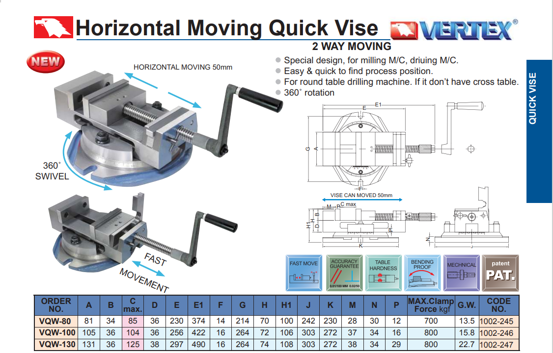 – Ê tô kẹp nhanh có thiết kế thêm mỏ kẹp vít me đặt biệt. Mỏ kẹp có thể tháo ra và nhấc lên nhanh chóng cho trục vít me di chuyển tự do dọc trục để thay đổi độ mở tùy thích ngay lập tức.