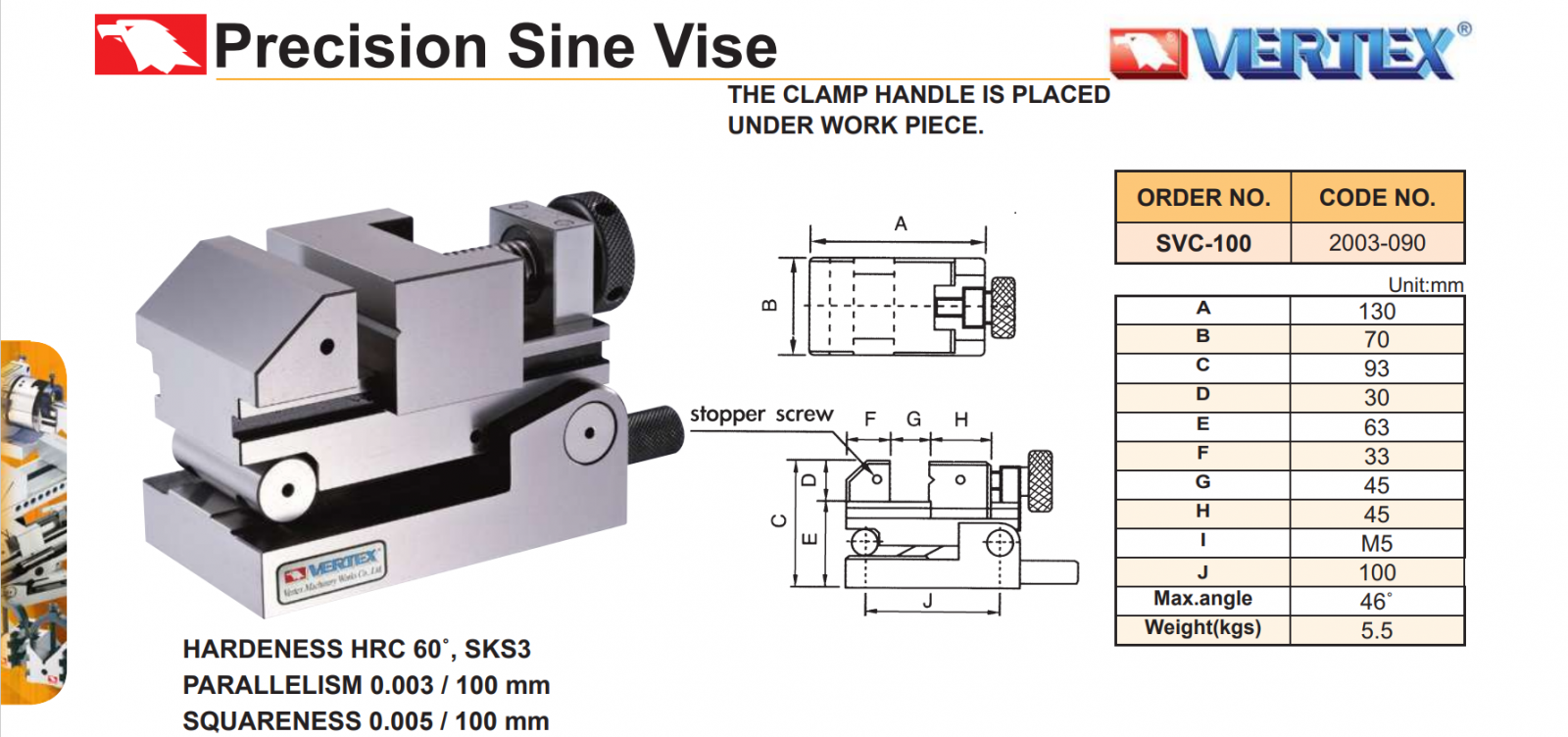 Ê tô máy mài nghiêng Vertex SVC-100 dùng để gá kẹp các chi tiết trong quá trình mài nghiêng.