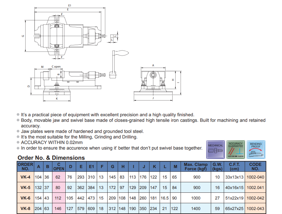 – Độ chính xác của ê tô kiểu VK là: 0.02mm.