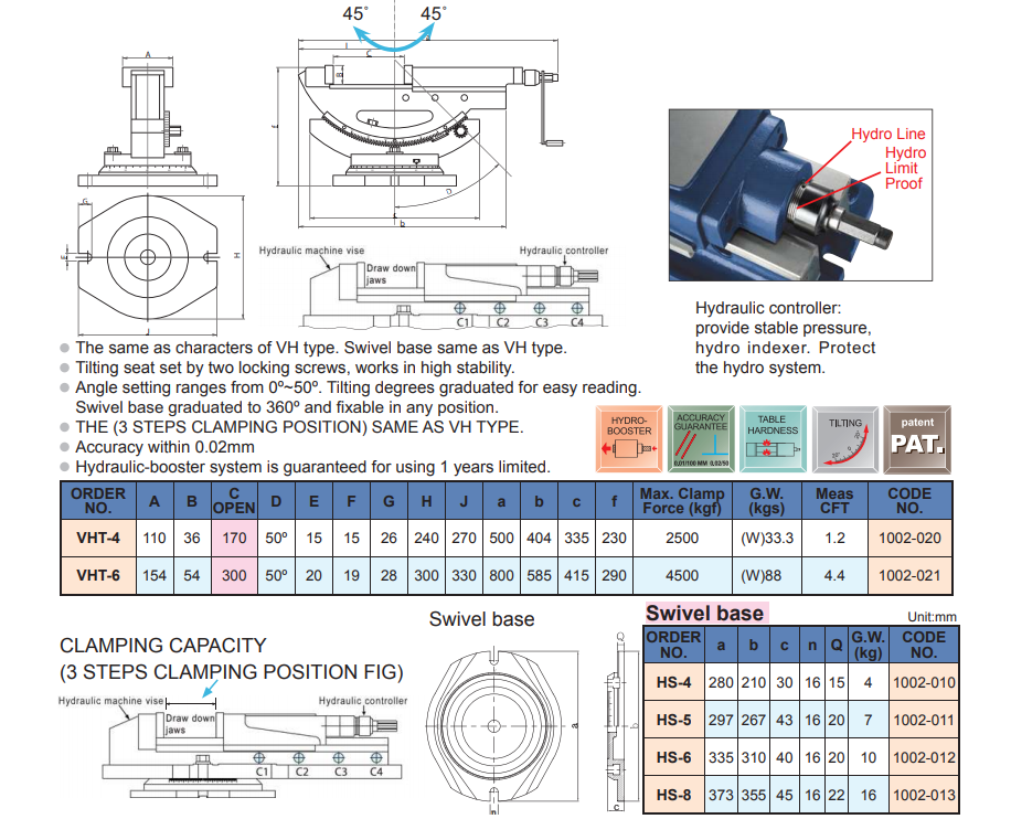 Thân ê tô thủy lực VHT này về cơ bản được cấu tạo giống với loại Ê tô thủy lực VH, chỉ khác ở chỗ là phần đế ê tô có thể nghiêng theo phướng đứng 0˚~ 50˚ và có thể xoay 360o giúp bạn có thể điều chỉnh góc nghiêng chính xác ở bất kỳ góc độ nào mà bạn cần.
