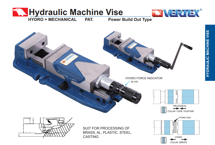 • Ê TÔ THỦY LỰC  mã VHO-5, VHO-6, VHO-8 và đế xoay đi kèm theo mã HSO-5, HSO-6, HSO-8 được hãng Vertex sản xuất với chất lượng cao, sản phẩm được sử dụng nhiều trên các loại máy phay CNC, NC, và một số loại máy phay vạn năng, tùy thuộc vào nhu cầu sử dụng của phân xưởng.