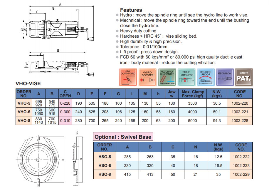 • Ê tô thủy lực loại VHO có hệ thống thủy lực, cường lực cho phép kẹp với lực kẹp rất lớn mà thao tao tác tay nhẹ nhàng nhờ hệ thống thủy lực hỗ trợ, giúp bạn có thao tác kẹp & siết chặt nhanh chóng, sử dụng dễ dàng.