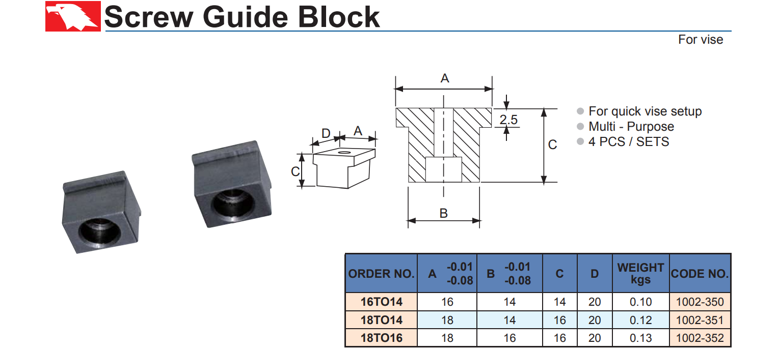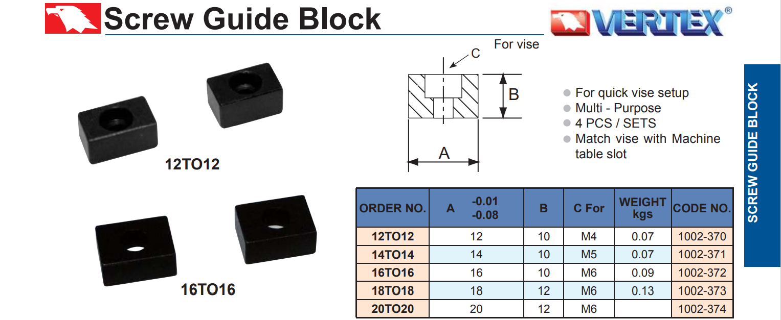 – Khối định vị ê tô trên bàn máy mã 12TO12, 14TO14, 16TO16, 18TO18, 20TO20, 16TO14, 18TO14, 18TO16,14TO16, 14TO18, 16TO18 của Vertex sản xuất, sản phẩm không thể thiếu cho việc gá kẹp định vị chính xác các loại ê tô trên bàn máy.