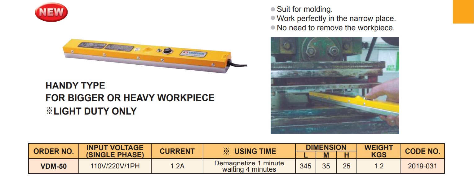 – Máy khử từ cầm tay VDM-50 của VERTEX dùng khử nhiễm từ cho các phôi lớn và nặng. Thích hợp khử từ cho khuôn mẫu.