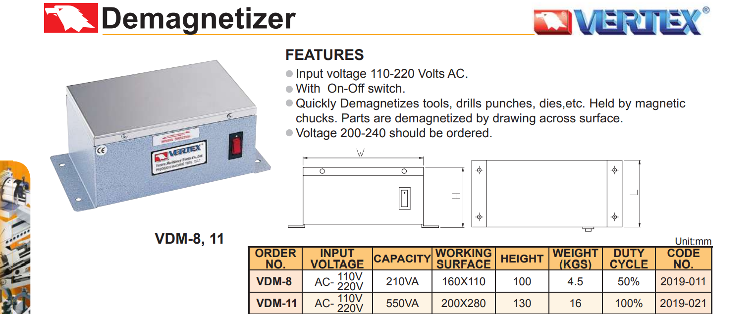 MÁY KHỬ TỪ mã VDM-8 , VDM-11 được hãng Vertex sản xuất với chất lượng cao, sản phẩm chuyên dùng cho việc loại bỏ tính chất từ tính cho vật liệu kim loại, được sử dụng rộng rãi trong nhà máy, xưởng gia công cơ khí.