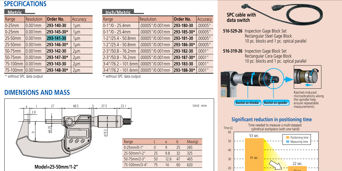 Mã hàng 293-186-30 là dụng cụ đo panme cơ khí điện tử đo ngoài khoảng đo từ 1-2''/25-50mm/0.001mm