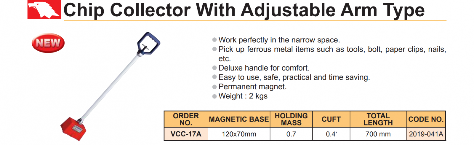 – Thiết bị thu phoi bằng nam châm VCC-17A có cánh tay dài, giúp người công nhân với hút phoi ở xa, không gian chật hẹp và không phải cúi người.