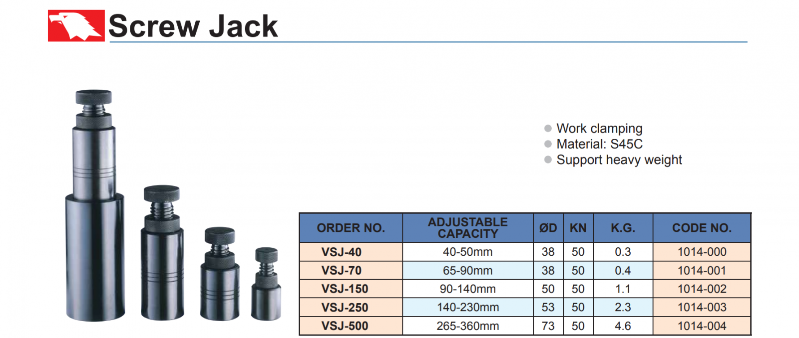 Vít nâng điều chỉnh phôi mã VSJ-40, VSJ-70, VSJ-150, VSJ-250, VSJ-500 được nhập trực tiếp từ Vertex, CO, CQ được cấp bởi phòng thương mại Đài Loan, sản phẩm dùng để điều chỉnh cân bằng phôi trước khi gia công. Hàng được phân phối và giao tận nơi trên toàn quốc.