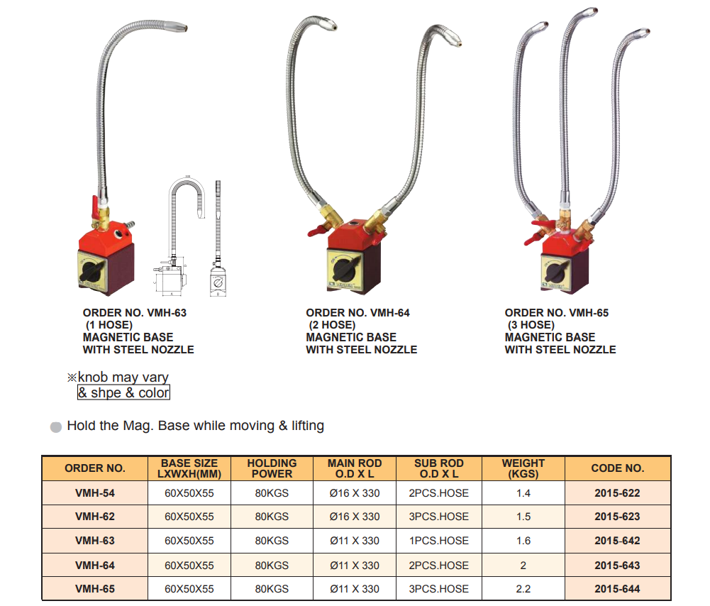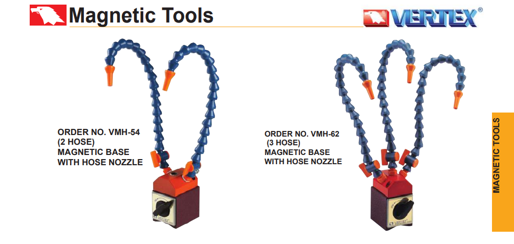 – Vòi tưới nguội đế từ VMH-54, VMH-62, VMH-63, VMH-64, VMH-65 của VERTEX sử dụng để gá kẹp đầu vòi tưới nguội trên máy gia công bằng lực hút của đế từ.